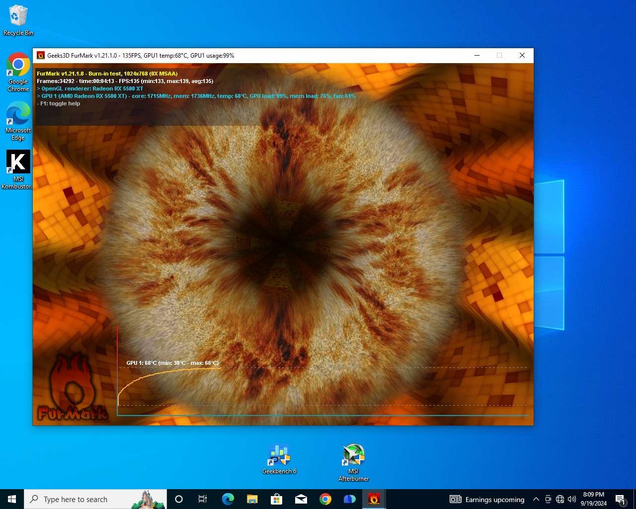 Rezultat test de performanta 3D, rezolutie 1024 x 768, Furmark 135 FPS, asa cum apare in poza de mai jos: