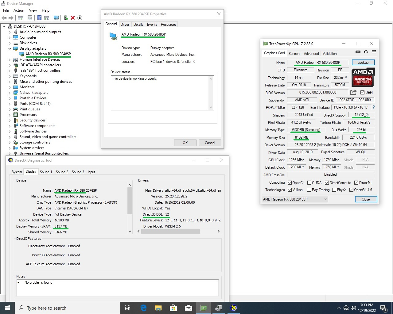 mouse click dreapta pe Start / Manager dispozitive (Device Manager) / Placi grafice(Display adapters) trebuie sa figureze „AMD Radeon RX 580 2048SP”, asa cum apare in poza de mai jos: