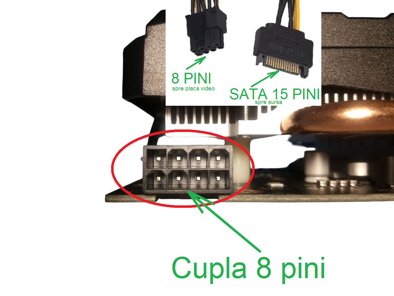 Se cupleaza alimentarea 8 pini direct din sursa in placa video sau in lipsa ei se va cupla adaptorul SATA 15 pini catre 8 pini livrat gratuit.