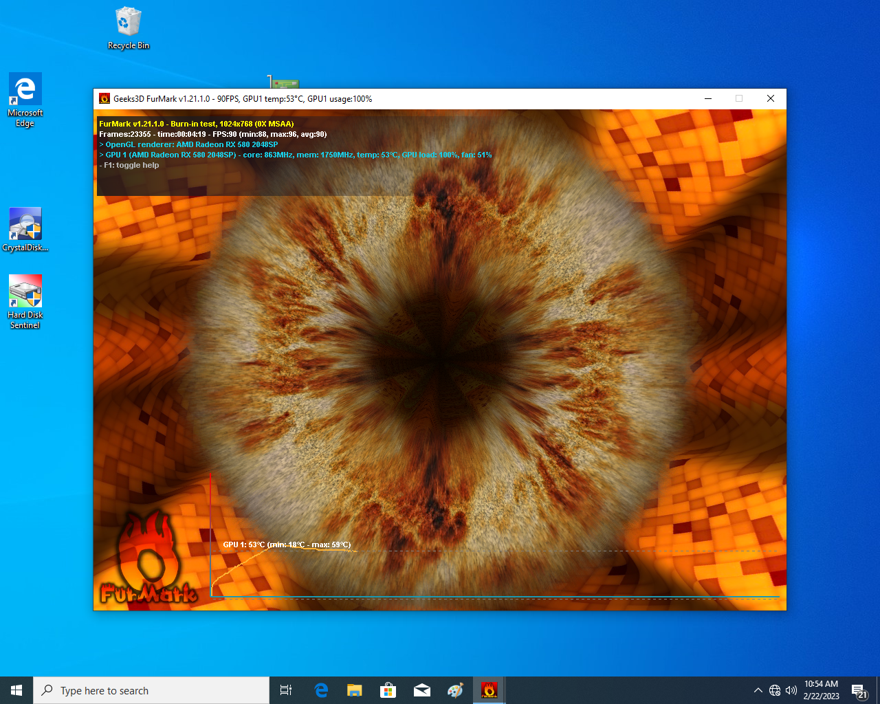 Rezultat test de performanta 3D, rezolutie 1024 x 768, Furmark, 90 FPS, asa cum apare in poza de mai jos: