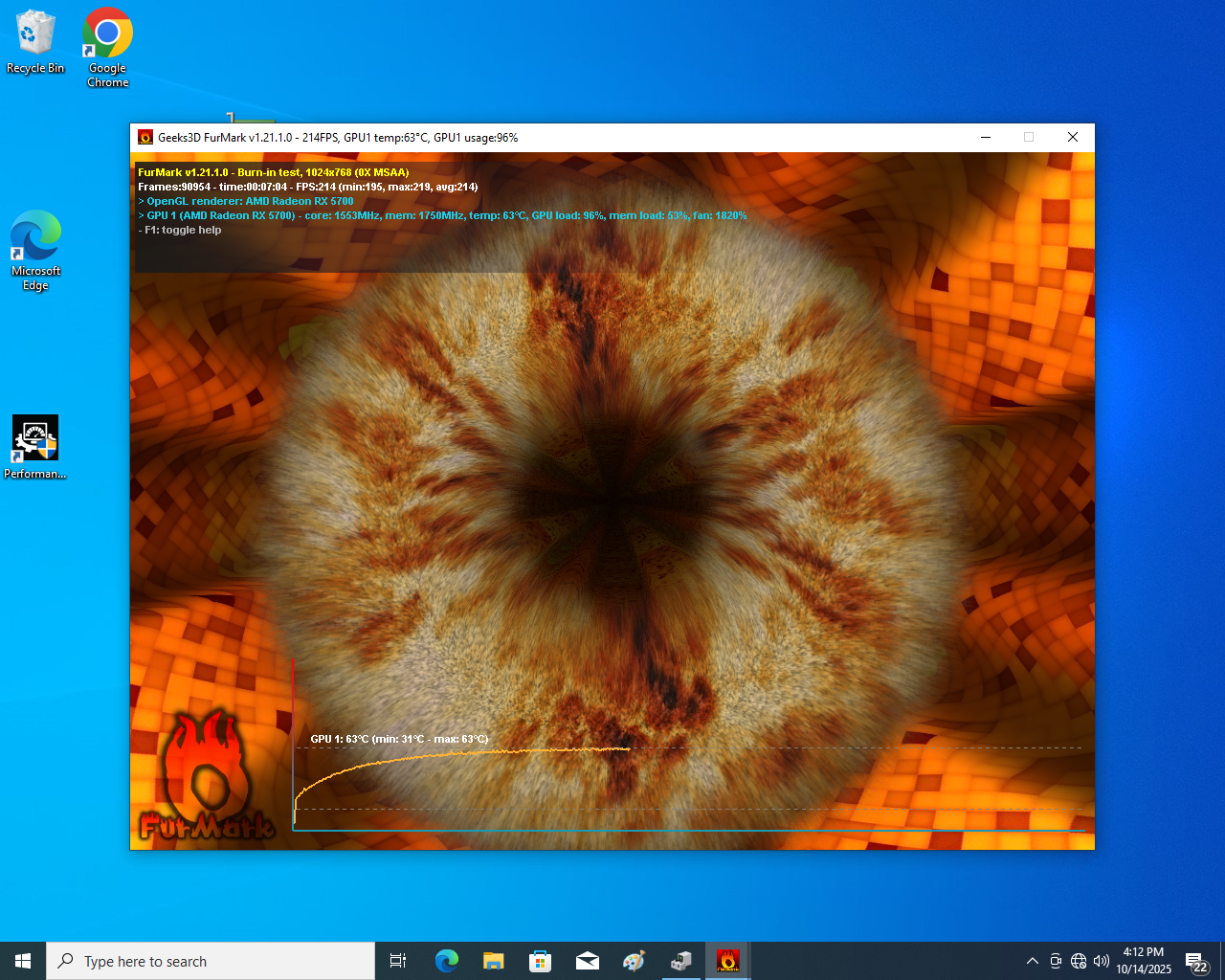 RX 5700, rezultat in test de performanta 3D, rezolutie 1024 x 768, Furmark 214 FPS, temperatura maxima 63 grade C, asa cum apare in poza de mai jos: