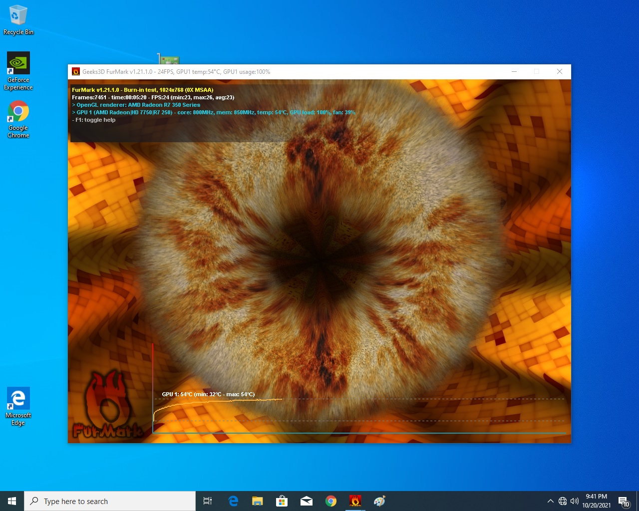 R7 350, rezultat test de performanta 3D, rezolutie 1024 x 768, Furmark 24 FPS, asa cum apare in poza de mai jos: